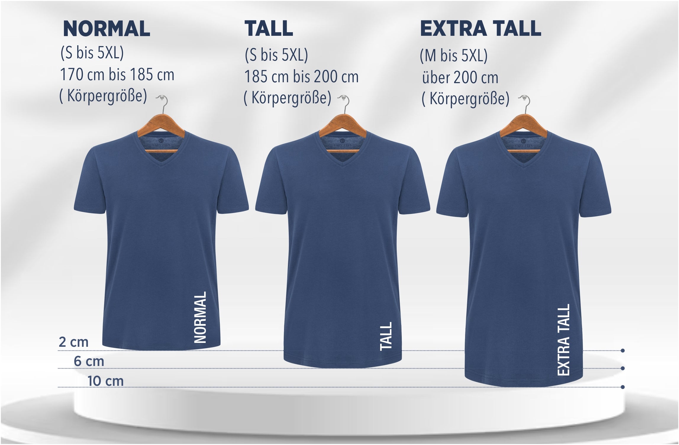 Vary Fits, T-Shirts haben ein einzigartiges Größen-System. Wir haben jede Größe von S bis 5XL in 3 Längen (Normal, Tall, Extra Tall) ım Sortıment. Die T-Shirts sind so konzipiert, dass sie jedem Mann von 175 cm bis über 2 m passen.