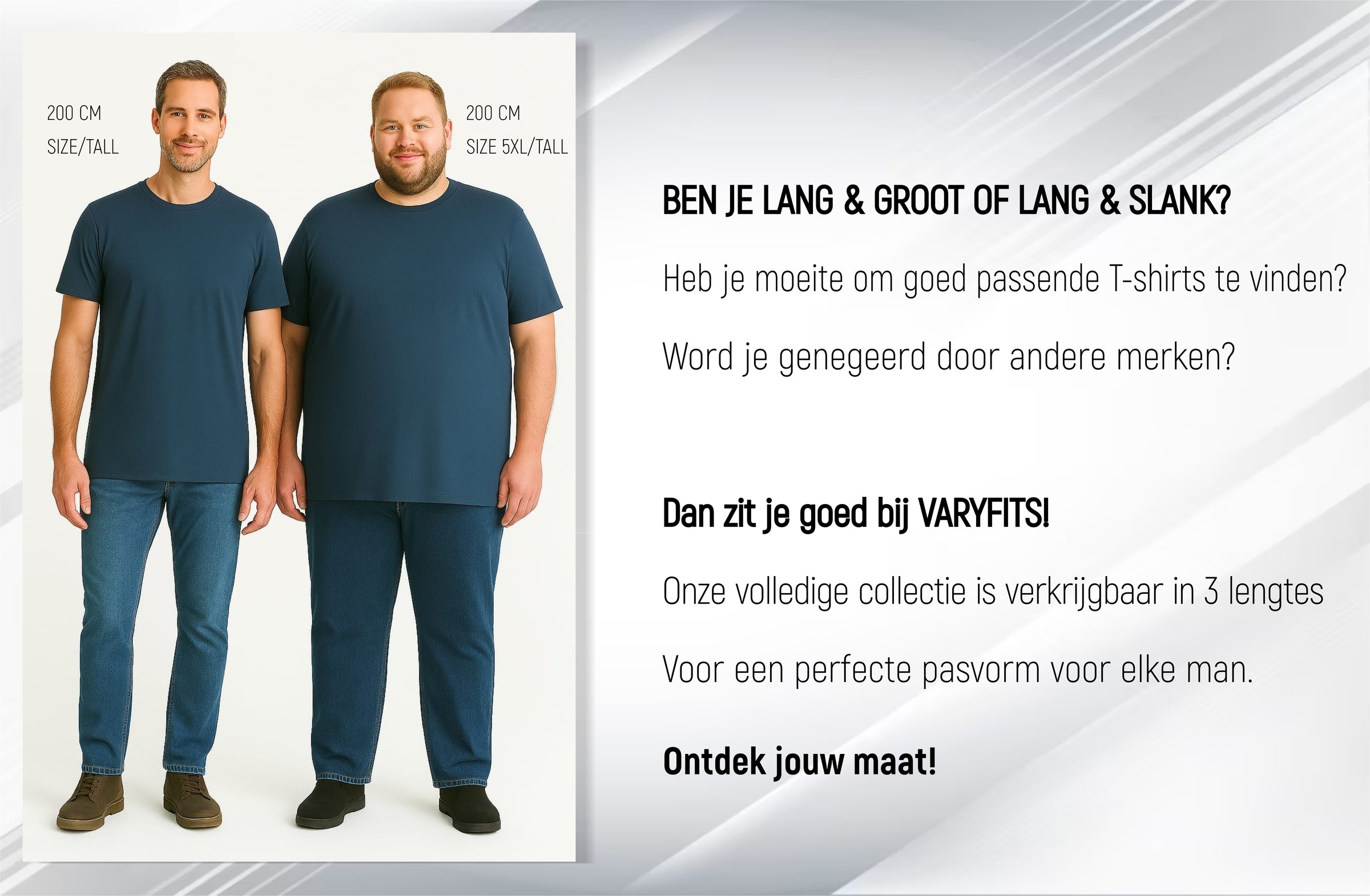 Vary Fits, t-shirts hebben een uniek maatsysteem voor elke man. We hebben elke maat van S tot 5XL in 3 lengtes (Normaal, Lang, Extra Lang) en ontworpen om elke man van 175 cm tot meer dan 2 meter te passen.